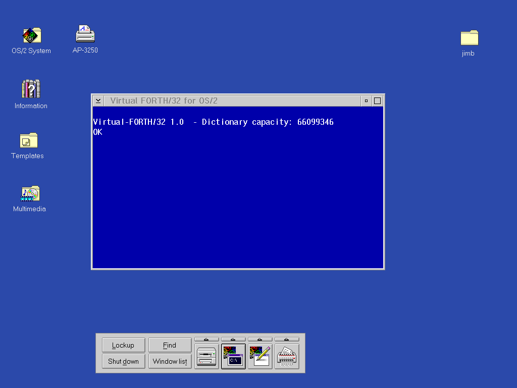 FORTH system screen  FORTH startup on OS/2 with a 64MB (megabyte) dictionary