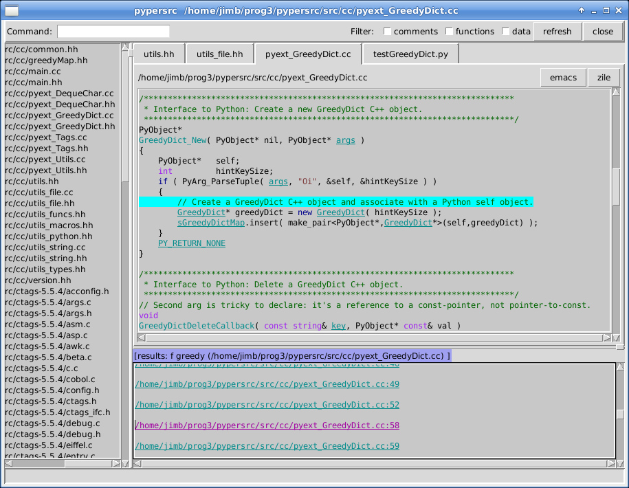 To compile, test, and install: tar xfjv pypersrc*tar.bz2 cd pypersrc ./configure.sh make out/pypersrc src # test if it can run make install To browse code: pypersrc . # browse all supported languages, descending from CWD pypersrc src/*.cc # browse particular source files pypersrc -l c++ # find C++ source files pypersrc -geom 800x600 # set size of main window pypersrc -ed-xterm zile # add zile as an external editor |